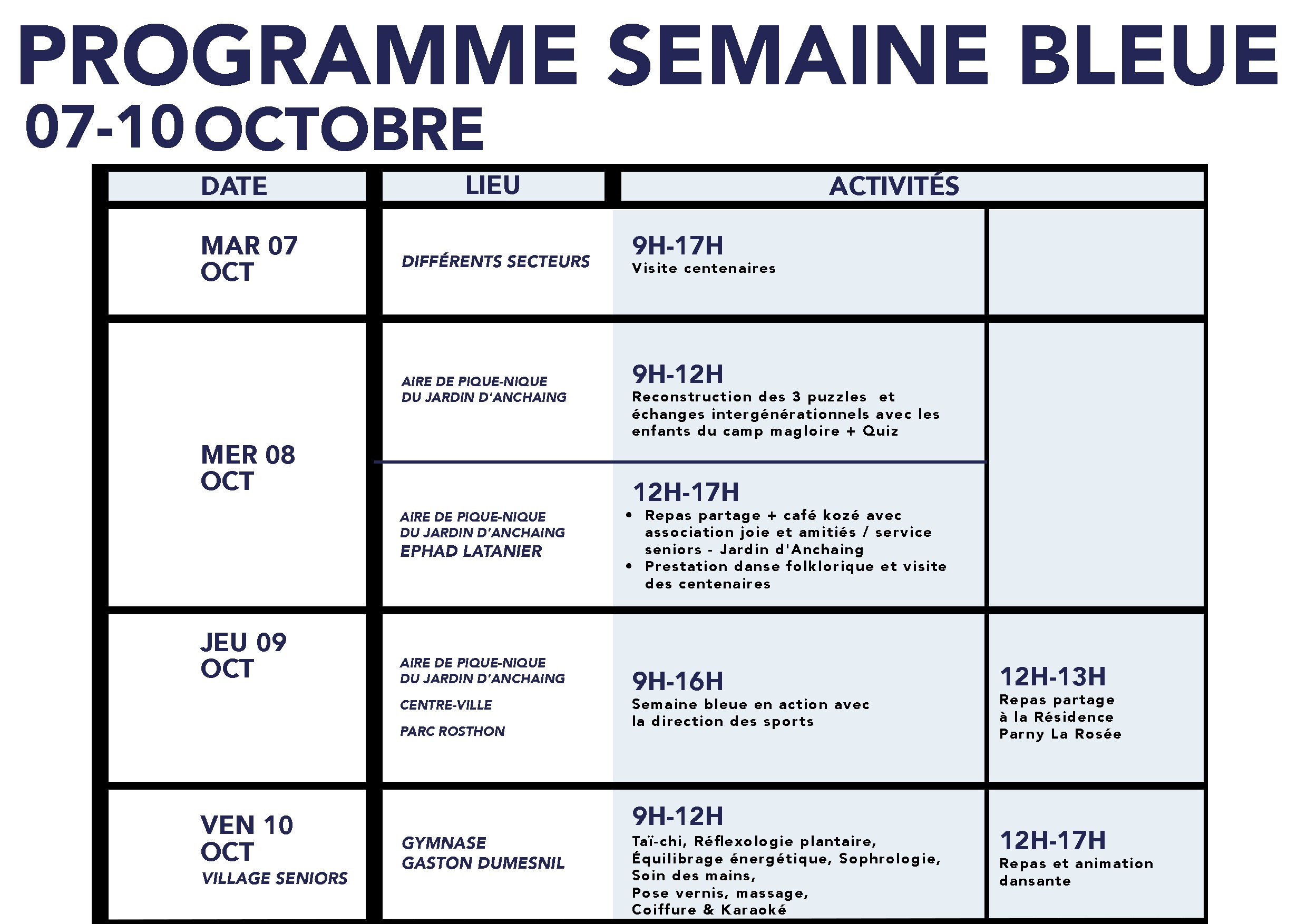 Visites aux centenaires, reconstitution de puzzles et échanges intergénérationnels avec les enfants de Camp Magloire, quiz, repas partage, café kozé, prestations de danse folklorique, taï-chi, réflexologie plantaire, équilibre énergétique, sophrologie, soins des mains, pose de vernis, massages, coiffure, karaoké et animations dansantes.